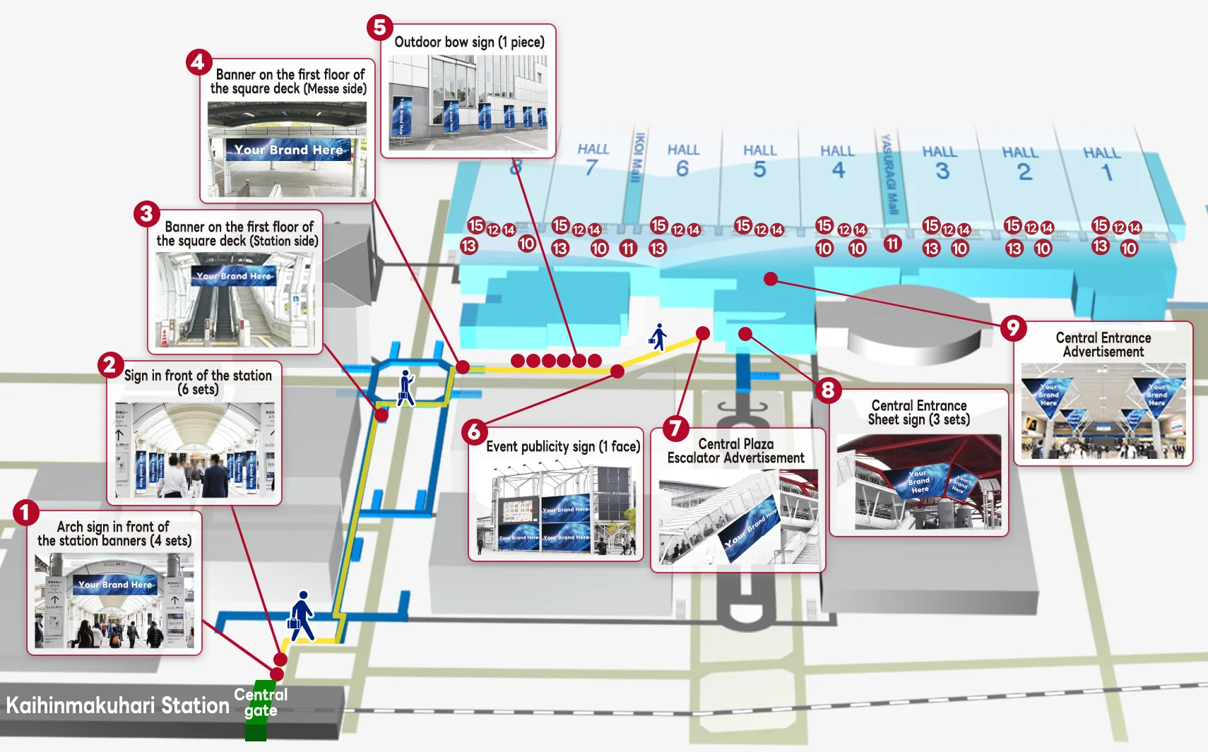 These are signboards that aim to effectively attract visitors to exhibitor booths along the route from JR Kaihin Makuhari Station to Makuhari Messe.