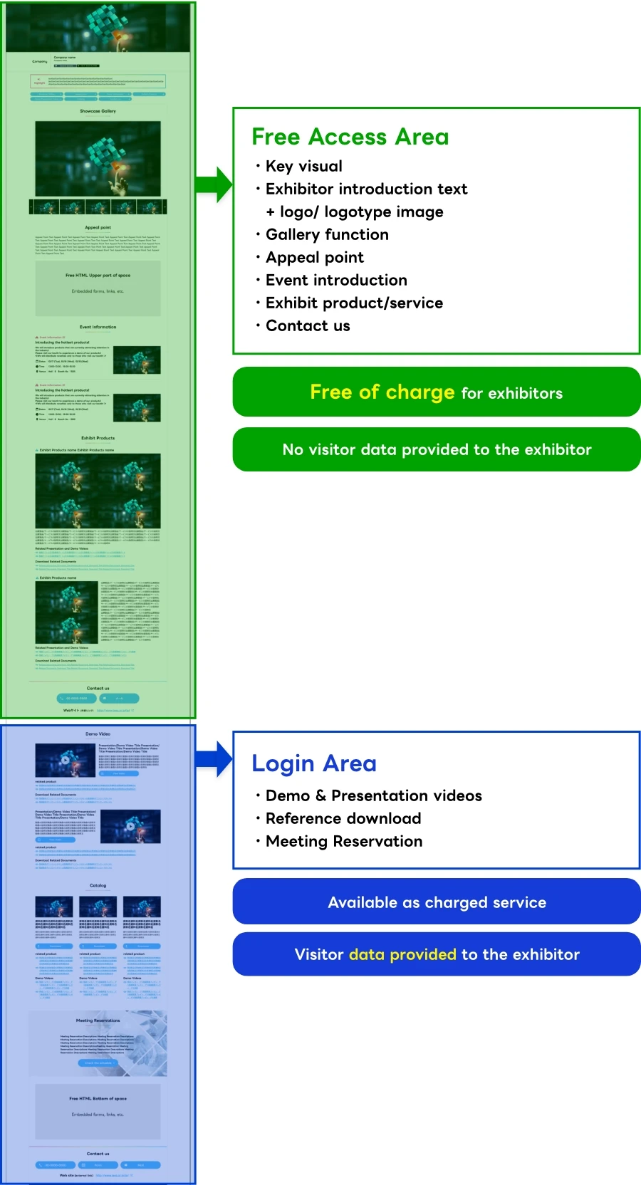 On the Exhibitor Detail Page, there is a “Free Access Area,” which anyone can view, and a “Login Area,” which can be accessed by creating an account after pre-registration. Only visitor data for those who accessed the Login Area will be provided.