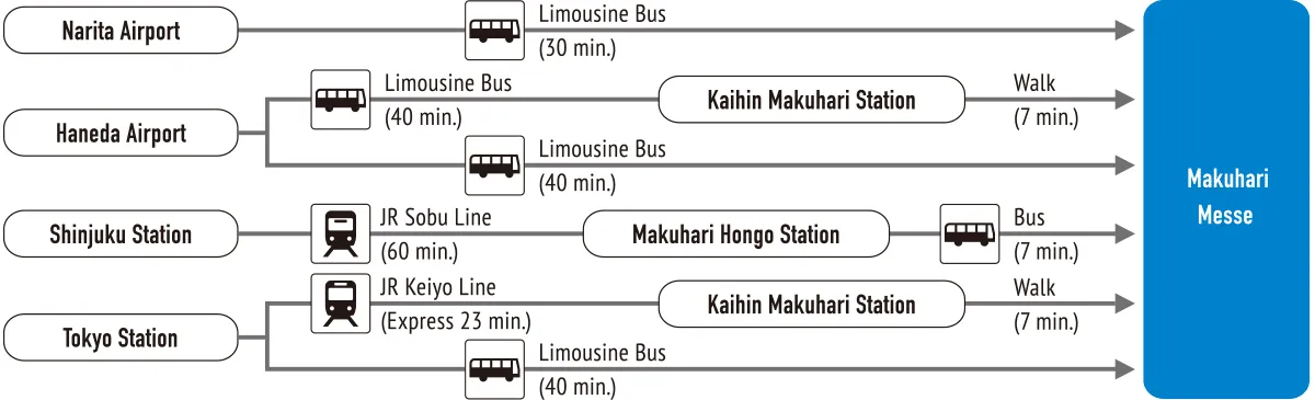 Limousine bus services will be operated from Narita Airport, Tokyo Station, Yokohama YCAT, Haneda Airport to Makuhari Messe.