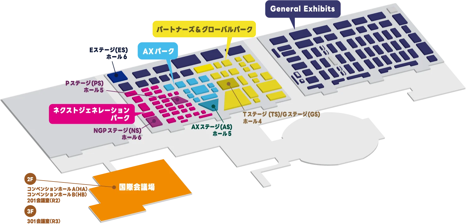 General Exhibitsは、「Society 5.0」の実現に向けた技術、製品、トータルソリューションを発信するエリアです。企業のビジョンや新たなビジネスモデルの発信、複数部門の横断的な展示、電子部品のアプリケーション別展示、先端技術紹介など、多様な出展が集まります。
